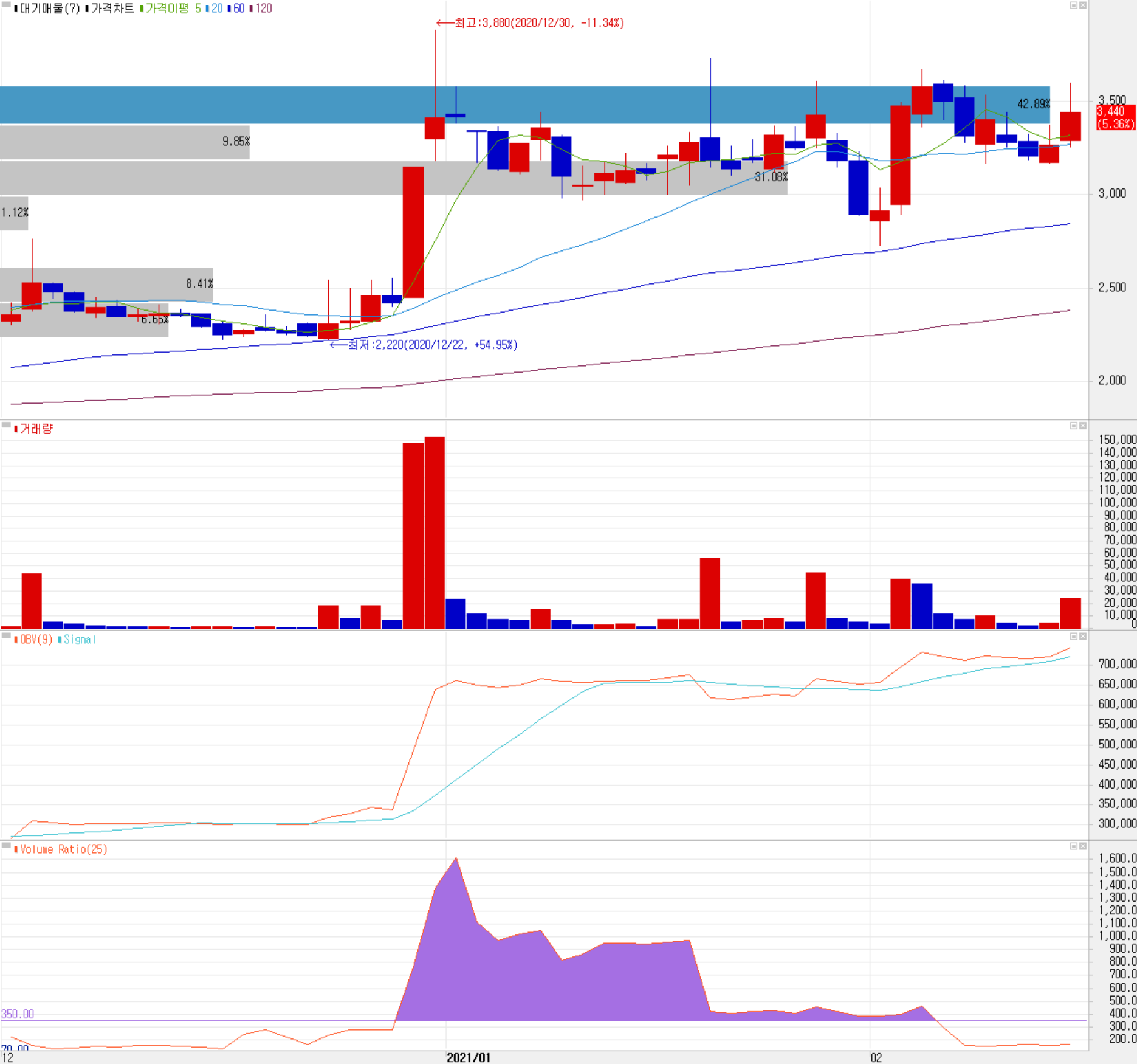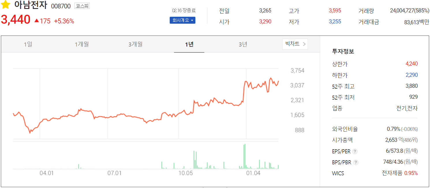 오늘은 주가가 좋은 흐름을 보이면서 2월 16일 장종료 기준 5.36% 오른 3,440원에 마감했습니다.