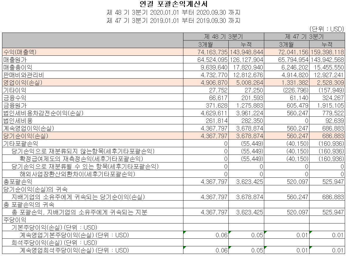 당사의 지난 2020년 3분기 누적 기준 매출액은 1억 4395만 달러를 기록하면서 전년 동기 대비 9.7% 감소, 영업이익은 98% 증가했고 당기 순이익 또한 435.5% 증가했습니다. 전방업체의 프리미엄 가전 시장이 중국, 인도 등 신흥시장의 성장과 함께 확대되면서 당사의 오디오 제품도 동반 성장하고 있습니다.