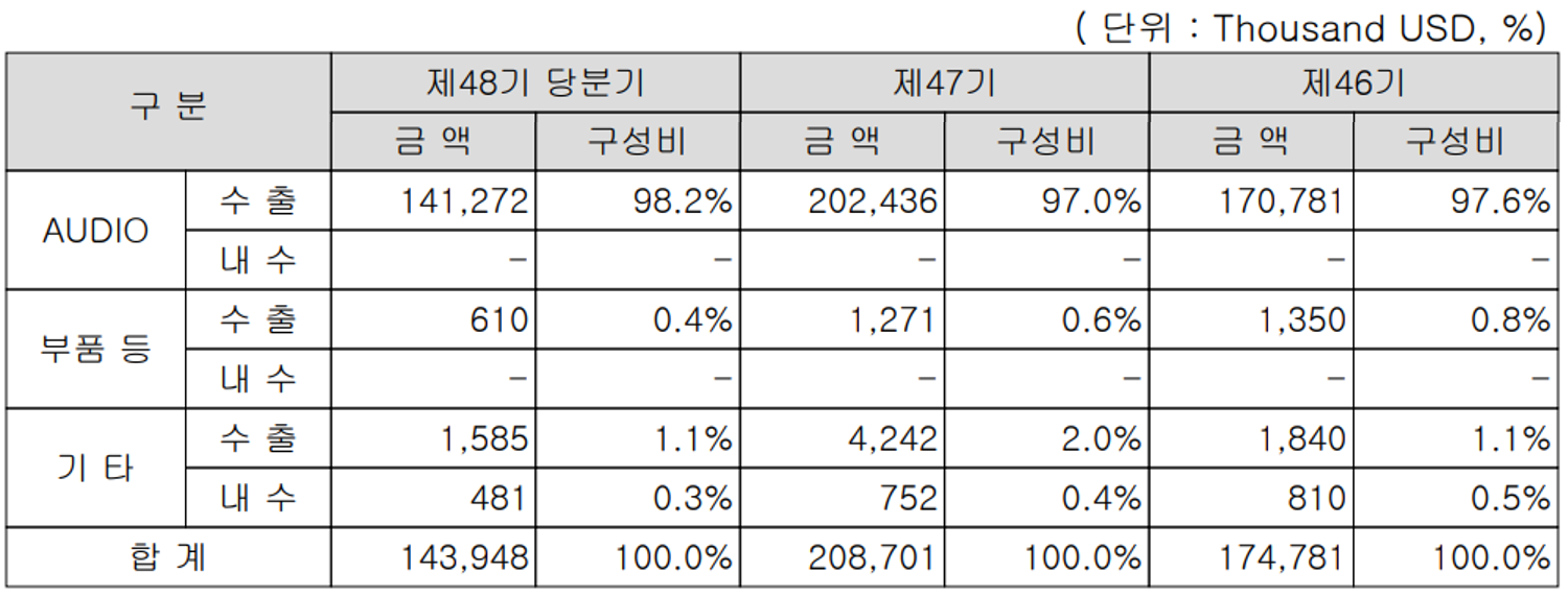 당사는 ODM 방식으로 대부분 베트남 현지법인을 통해 수입 수출하다 보니 보고서에 기재된 통화는 USD입니다. 오디오(AV) 관련 매출 비중이 98.2%로 대부분을 차지하며, 기타에는 브랜드 사용권 수익 및 당사의 본사 건물 임대 수익 등이 포함되어 있습니다.