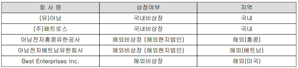 당사의 계열회사에는 당사의 지분 20.23%를 보유하고 있는 최대주주인 (유)아남을 포함하여, 종속기업인 아남전자 홍콩 유한공사와 아남전자 베트남 유한공사가 있습니다.