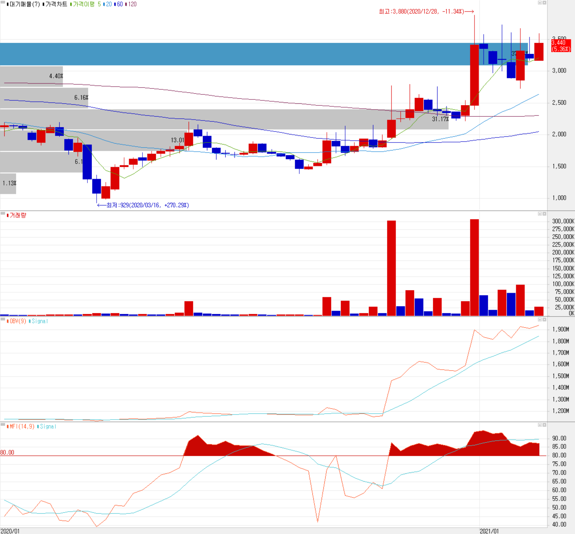최근 수급에서는 연기금과 투신 등이 매수 우위를 보이는 가운데 개인의 매수세가 강하게 들어오고 있습니다. 차트는 애플카 테마에 따른 등락을 제외하면 지난 연말부터 2900원 ~ 3500원 사이 박스권을 형성하고 있으며, 오늘 기관과 외국인의 동반 매수로 박스권 이탈을 노렸지만 오후 들어 일부 상승폭을 되돌리면서 마감되었습니다. 개인적 판단에 의하면 차트상 점차 상승을 위한 초입이라고 판단되며, 거래량이 동반되면서 매물대를 돌파한다면 전고점까지는 쉽게 갈 수 있을 것으로 예상됩니다. 하락 시 손절가는 3,100원으로 설정했습니다. 아래 주봉에사의 MFI는 현재 과매수 상태를 보이기 때문에 스윙투자자 입장에서는 좀더 지켜봐도 나쁘지 않을 것 같습니다.