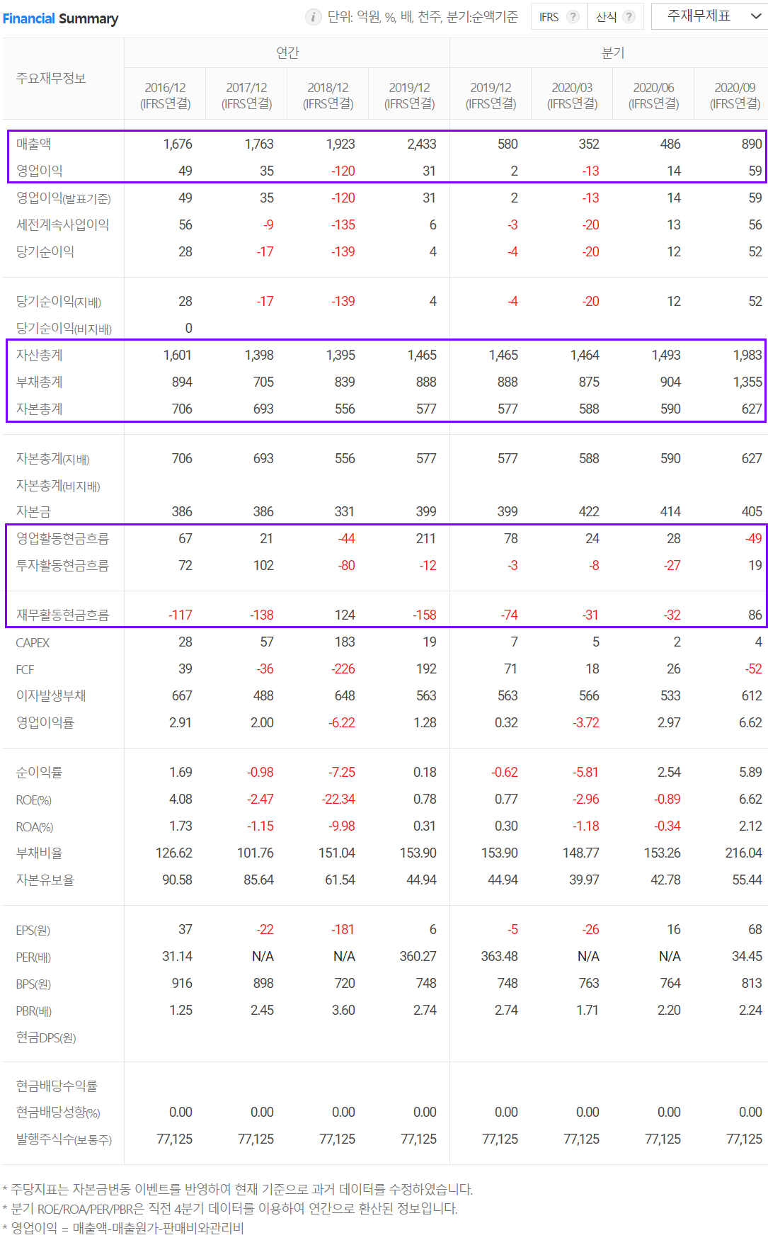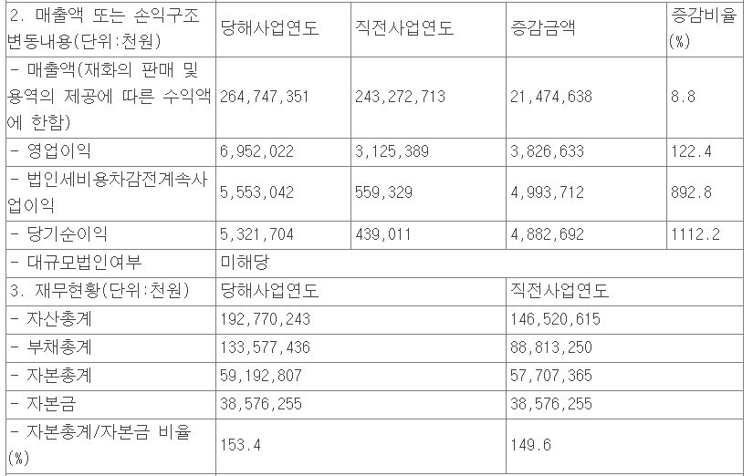 당사의 지난 2월 9일 발표된 2020년 잠정실적에 대한 공시에 따르면, 연 매출액 2,648억 원으로 전년 동기 대비 8.8% 증가했고, 영업 이익은 69억 원을 기록하면서 122.4% 증가, 당기순이익은 53억 원으로 1112.4% 증가했습니다.