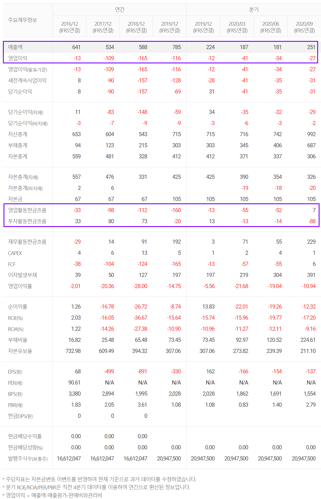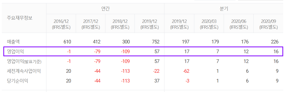 지난 3년간 영업적자가 지속되면서 관리 종목 위기가 있었으나, 2019년 물적 분할에 따른 구조 개편 등으로 흑자전환하였습니다.