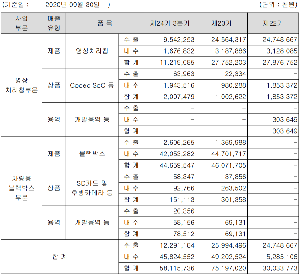 2020년 3분기 말 기준 영상처리 칩 부문의 매출은 112억 원으로 당사 전체 매출액의 19.6%, SoC Codec은 3.5% 그리고 차량용 블랙박스 제품이 446억 원으로 76.8%의 매출 비중을 보였습니다.