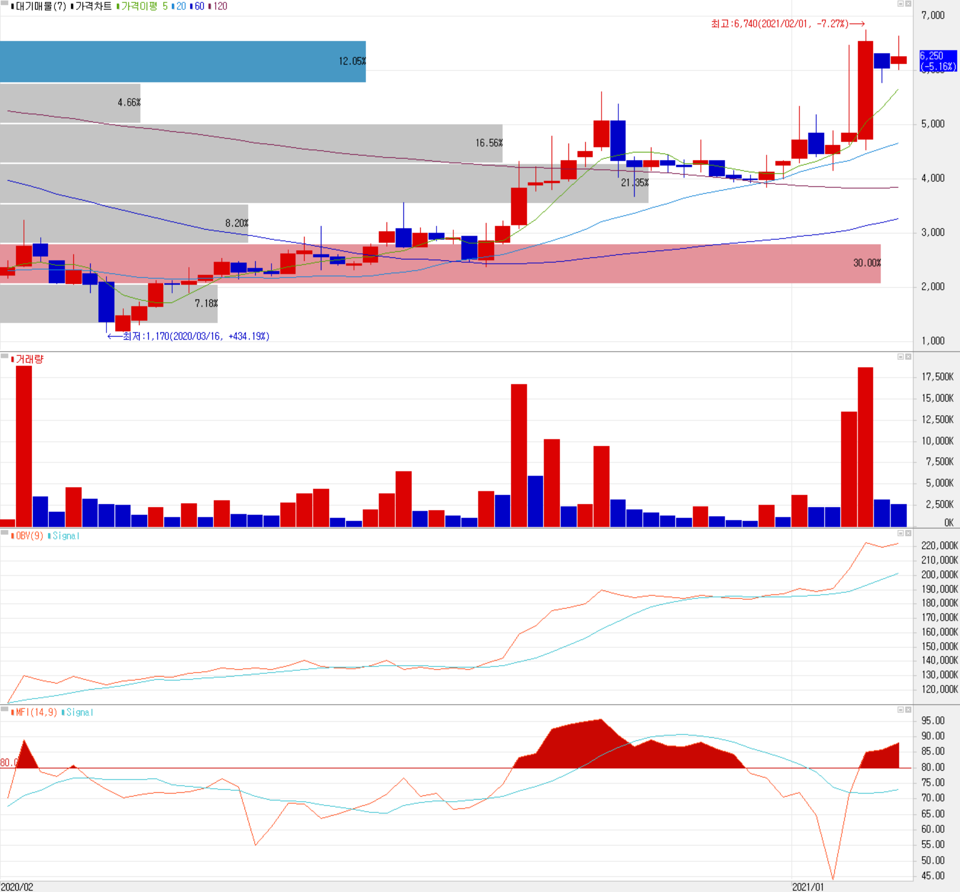 당사의 일봉 차트를 보면 지난 9월 중순 자동차 전장용 반도체에 대한 기대감으로 큰 폭의 상승을 했었고, 지난 연말연시 기간 동안 반도체와 자율주행 테마에 의한 상승이 있었습니다. 기술적으로 전반적인 추세의 흐름은 유효하다고 판단되지만, 최근 급등에 따른 매물이 소화되는 시간이 필요할 것 같습니다. 이평선 정배열 상태로 2월 18일 5일 선을 터치했으나, VR, MFI 등의 보조지표를 종합해 볼 때 조금 과매수 상황인 것도 참조해야 할 것 같습니다.