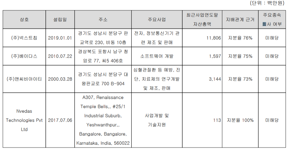 당사는 2020년 3분기 말 기준 4개의 계열회사를 보유하고 있습니다. 넥스트칩은 2019년 1월 자동차용 카메라 관련 팹리스 업체로 분할 신설되었고, 소프트웨어 개발을 영위하는 베이다스, 유전자재조합 지혈제를 연구, 개발하는 바이오 기업 앤씨바이티 그리고 사업 개발 및 기술 지원 목적으로 설립된 Nvedas Technologies 등이 있습니다.