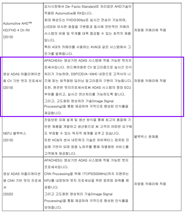 또한 당사는 APACHE 4 출시 이후 AI 기술을 접목한 CoC 제품을 개발 중에 있으며, 열화상 센서 등의 이종 센서 지원 프로세서 분야에서 원천 기술을 개발하는 등 자동차 전장 시장을 겨냥한 고부가가치 기술을 개발할 예정입니다.
