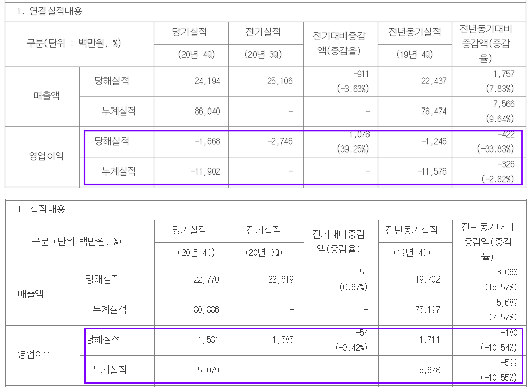 별도 기준의 영업이익은 연결 기준 손실폭 확대에 따라 감소했으나 누적 기준 51억 원으로 잠정 마감될 것 같습니다.