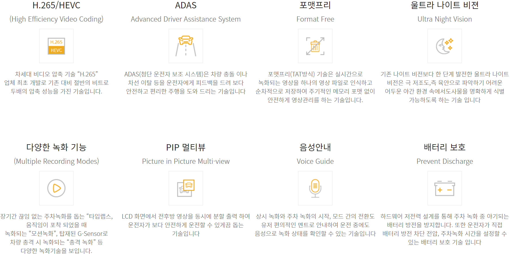 당사의 블랙박스는 기존의 블랙박스가 가지고 있는 기능을 넘어 나이트 비전, WDR 등을 적용한 카메라 설계는 물론, 자율 주행의 핵심 기술은 첨단 운전자 보조 시스템(ADAS)의 지원과 이산화탄소 센서를 이용한 졸음운전 경고 표시 및 농도 측정에 따른 두통을 방지하는 환기 알림 시스템을 제공합니다.