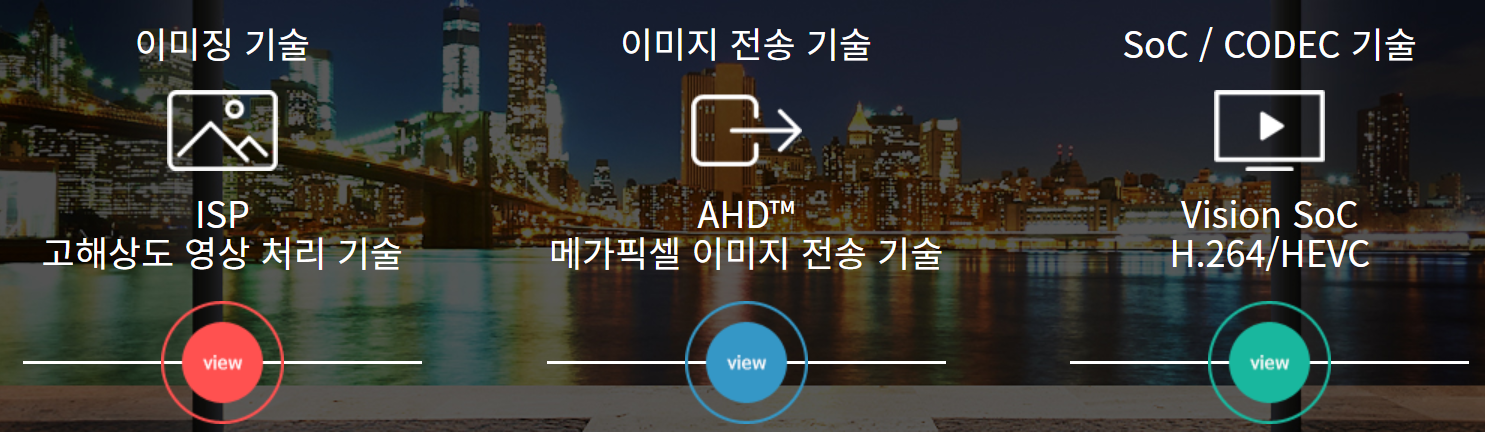당사의 독자적인 영상 처리에 관한 반도체 기술은 CCTV 카메라와 DVR(Digital Video Recorder)을 이용하여 다수의 영상 신호를 디스플레이, 전송, 저장하는 시스템으로 고해상도 영상처리 기술, 이미지 전송 기술 및 SoC / Codec 기술 등이 있습니다.