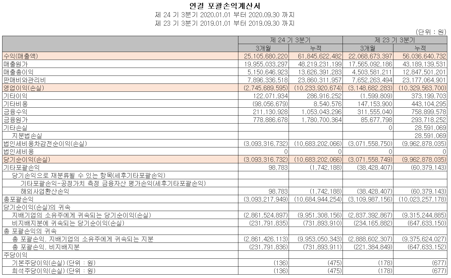 오늘 공시된 결과에 의하면 연결 기준 영업 손실은 누적 기준 119억 원으로 적자 폭이 확대되었고, 매출액은 860억 원으로 전년 동기 대비 9.64% 증가했습니다.