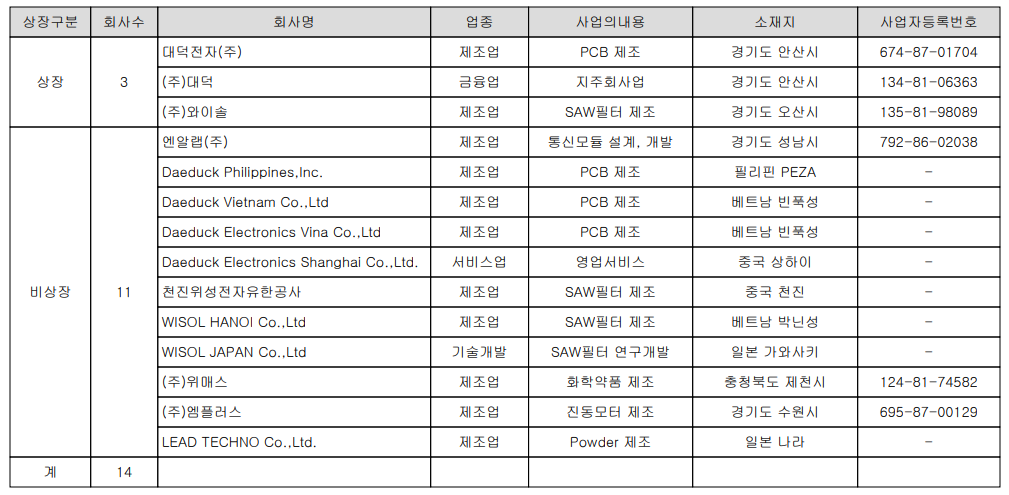 당사의 계열회사에는 당사의 지주회사인 (주)대덕과 SAW필터를 제조, 공급하는 (주)와이솔 등 당사 포함 3개의 상장사가 있고 11개의 비상장사가 있습니다. (주)대덕은 당사의 지분 31.5%를 보유한 최대주주입니다.