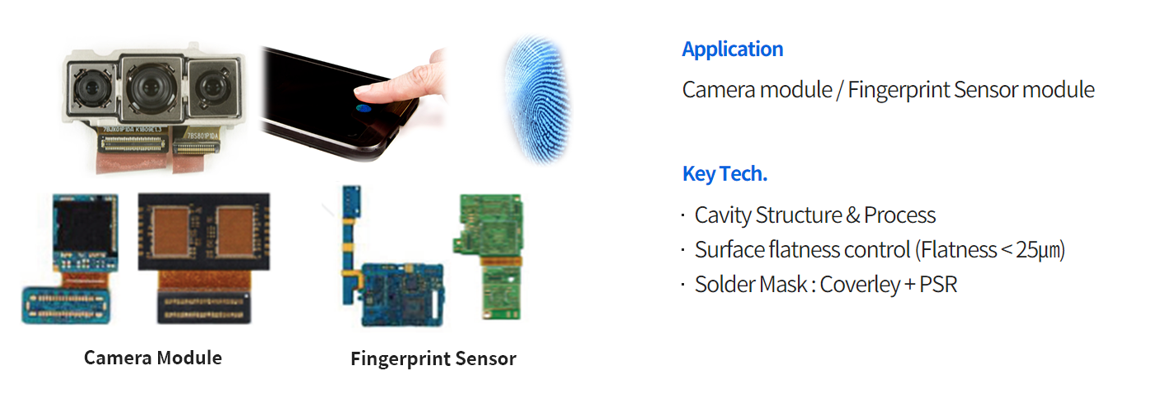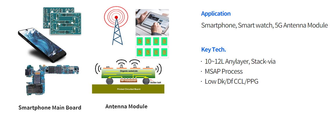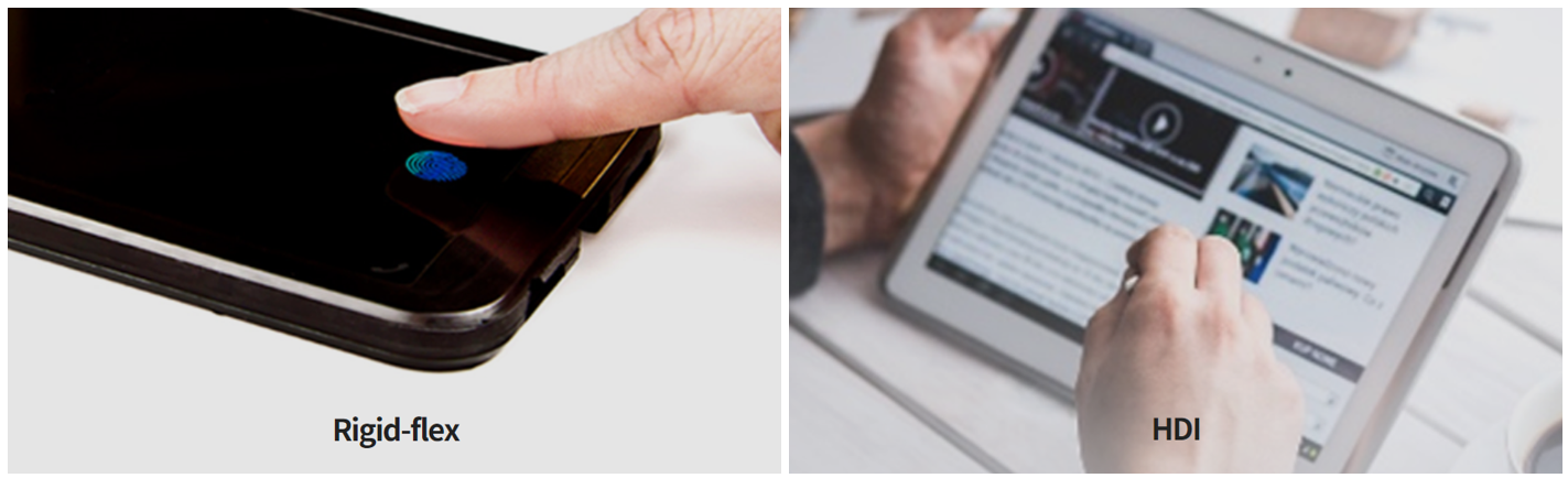 당사의 스마트폰 용 PCB는 두께 0.4~0.7mm 의 고밀도 PCB로써 Build-up 공법을 적용한 HDI PCB와 연성회로기판(PCB) 기술이 적용된 Rigid-Flexible PCB가 있습니다.