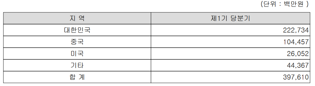 당사의 국가 별 매출 구조를 보면 국내 매출이 2,227억 원으로 전체 매출의 56%를 차지하고, 중국 26%, 미국 6.6%의 비중을 보이고 있습니다.