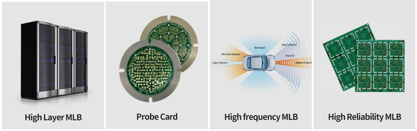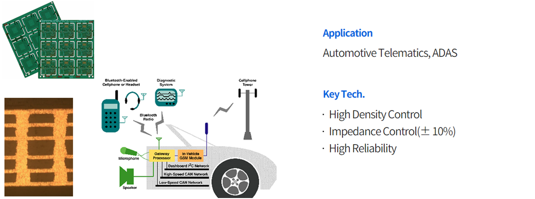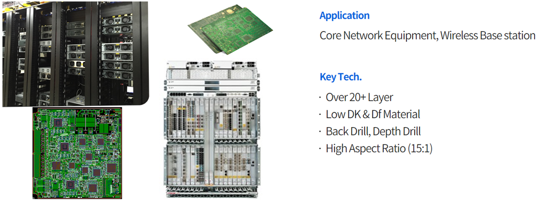 일반적으로 1.0mm이상의 두께를 갖는 PCB로서 20층 이상의 고다층 구조를 가지고 있으며, 최근 자율주행 자동차 및 5G 통신인 Telematics를 위해 고주파 및 고신뢰성 PCB가 사용되는 추세입니다.