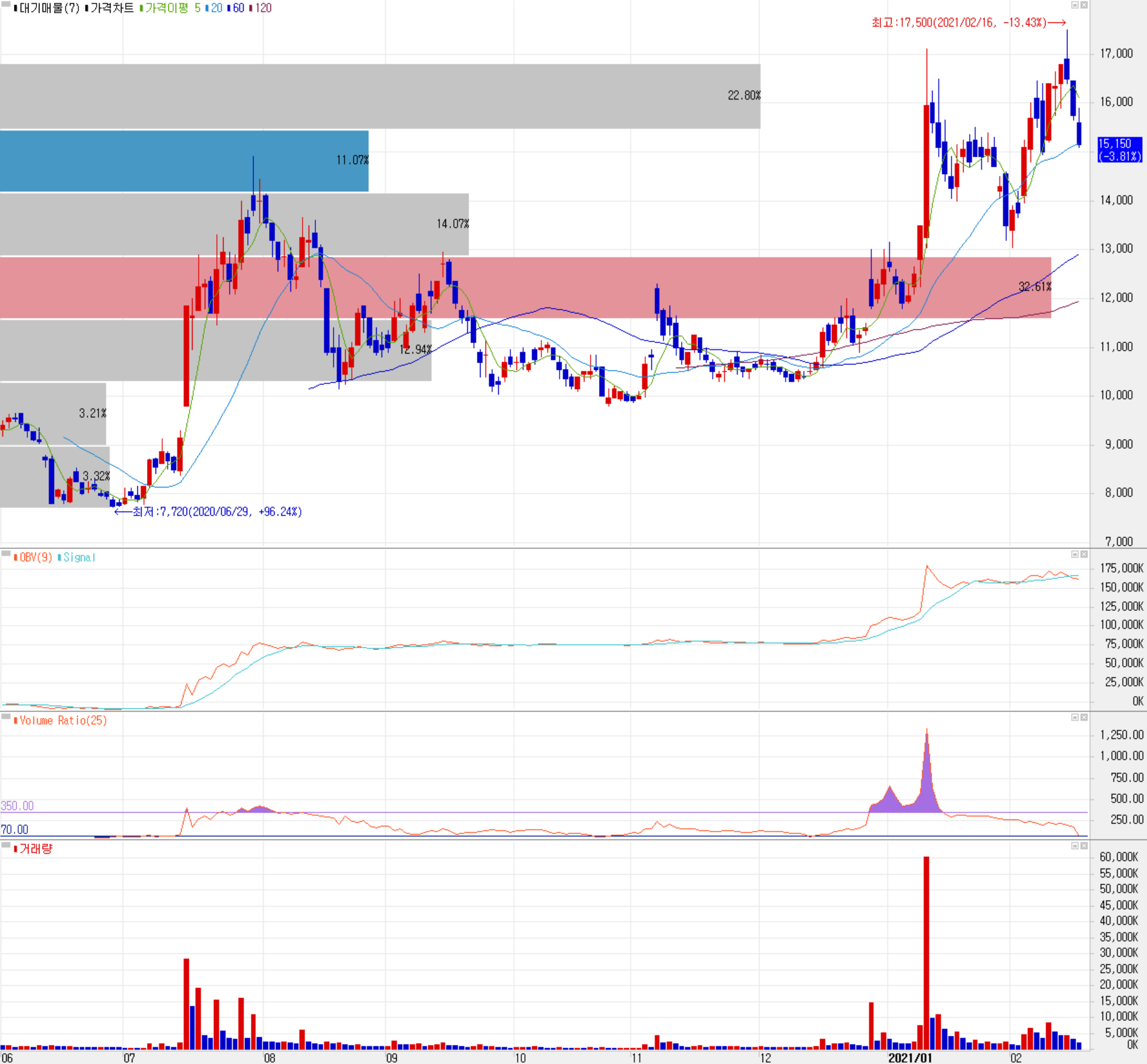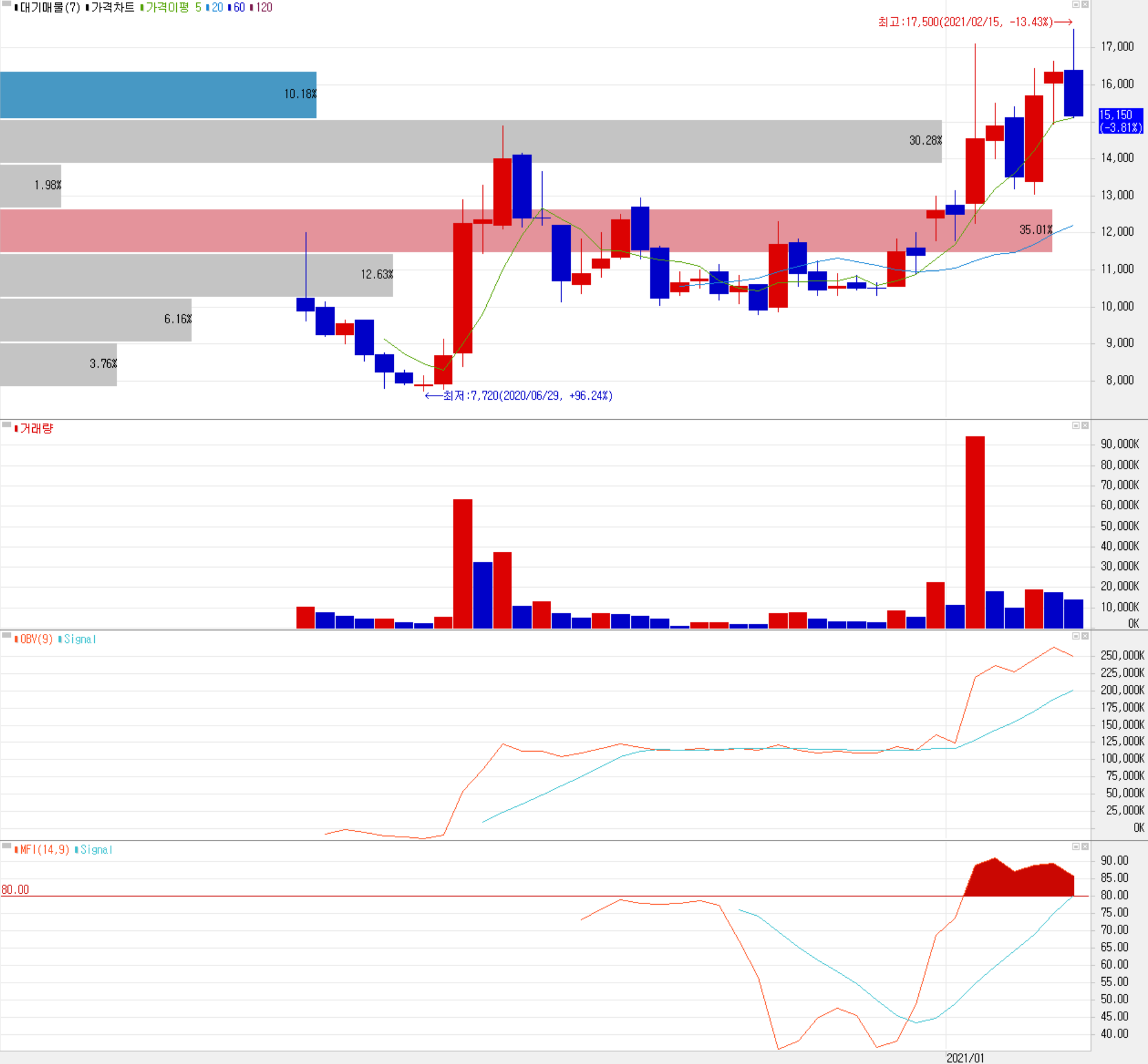 지난 5월 인적부할 후 5월 21일 재상장된 대덕전자의 일봉 차트입니다. 2021년 들어서면서 반도체 슈퍼사이클 도래에 따른 부품 및 재료의 품귀현상 소식에 주가가 크게 반등하였으나 최근까지 변동폭이 큰 모습을 보이면서 매물을 소화하는 것으로 보입니다. 수급에서는 연기금을 포함한 기관의 보유량이 큰 편이지만, 최근 3 거래일 연속 기관의 매물을 개인이 받아내는 상황입니다. 기술적으로는 OBV, VR, MACD 등의 보조지표가 하향 돌파하면서 추가 하락을 예상하게 합니다. 추세상으로는 하락 시 14,000원 을 지지선으로 보고 있습니다. 상승 시 16,500원 ~ 17,000 원 사이에서 매물 소화 과정을 지켜봐야 할 것 같습니다. 개인적으로 목표가는 17,000원을 보고 있습니다. 중장기적으로는 매력적이기는 하지만 가격 부담이 있기 때문에 4분기 실적을 기다리면서 관망 예정입니다.