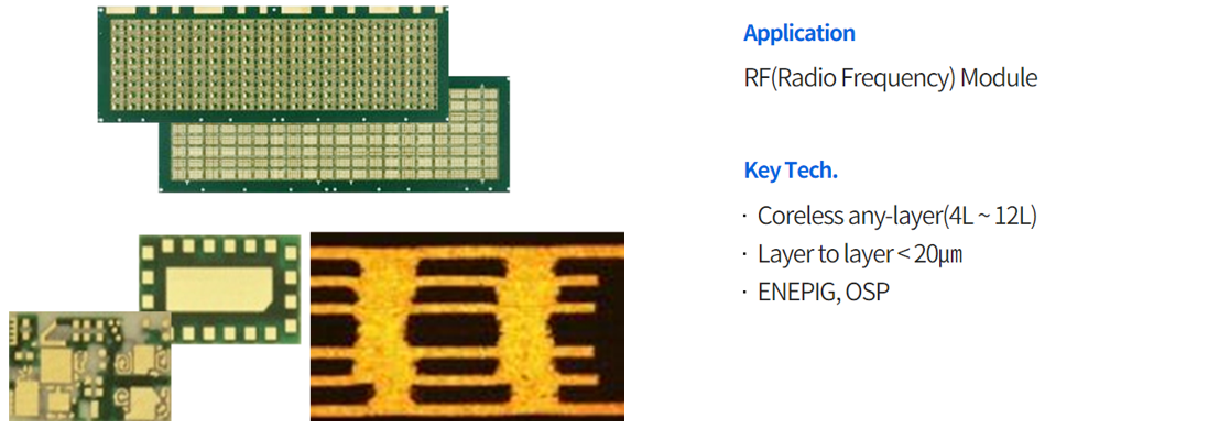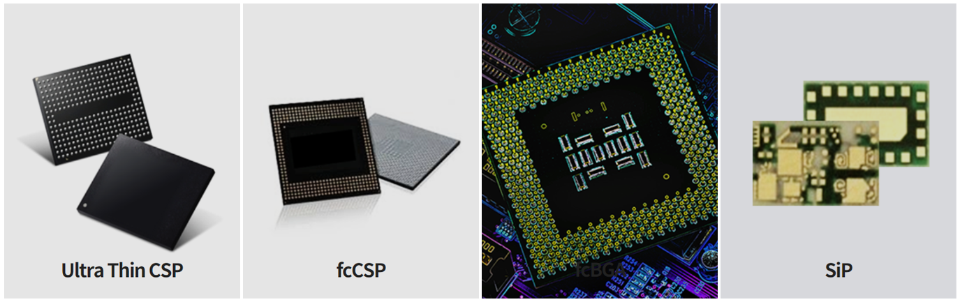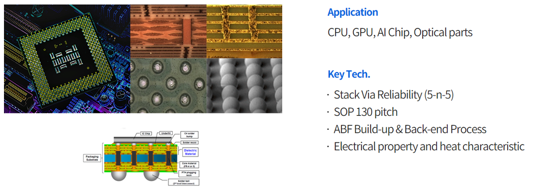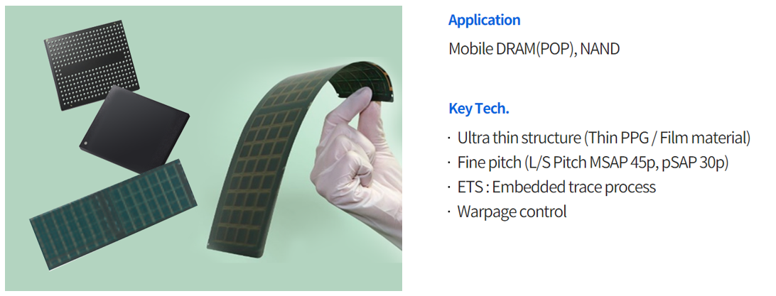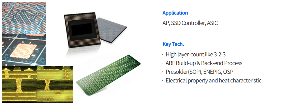 반도체 패키징 공정에서 사용되는 PCB(Printed Circuit Board)로서 IC substrate라고도 부르며, PCB 제품 중에서 가장 미세한 회로로 구현됩니다.