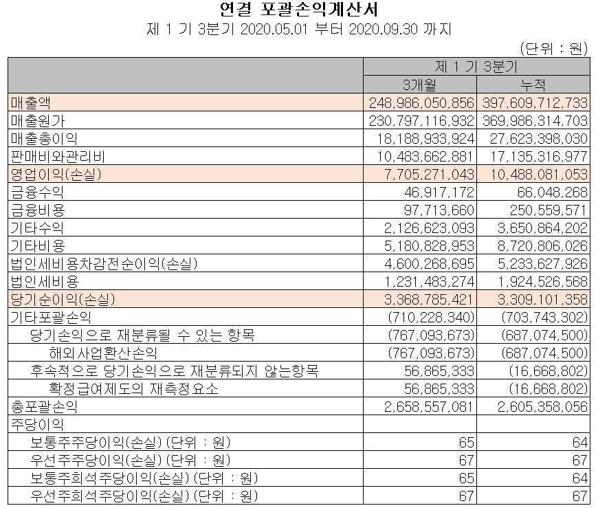 당사는 지난 2020년 2분기에서 3분기에 걸쳐 인적 분할 시 수익이 부진한 HID 사업 중단 및 전장 부품의 일부에 대한 사업 중단 등 내부 조정을 하면서 비용이 발생하여 2분기 영업이익률이 저조했으나 3분기에는 매출과 영업이익 면에서 회복된 모습을 보였습니다.