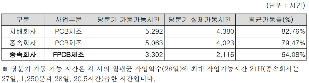 PCB 제조 설비의 가동률은 평균 80%를 조금 웃도는 수준이라 적절해 보입니다만, FPCB 제조 설비의 가동률은 여유가 있는 상황으로 판단됩니다.