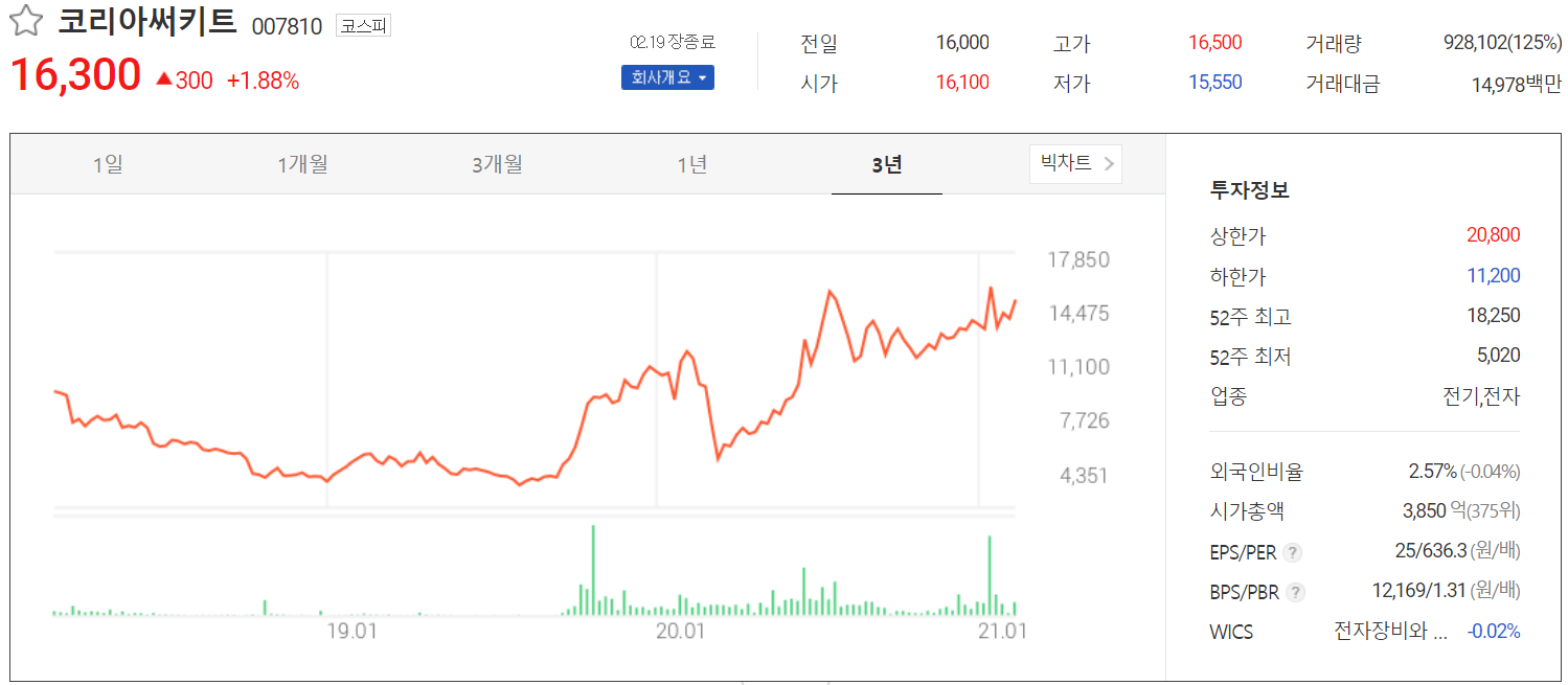당사의 주가 흐름은 코로나19로 인한 급락 이후 회복되면서 꾸준히 우상향하고 있는 모습입니다. 2월 19일 장 종료 기준 16,300원에 거래를 마쳤습니다. 외국인 비중은 2.57%이며, 시가총액 3,850억 원으로 코스피 상위 375위 종목입니다.