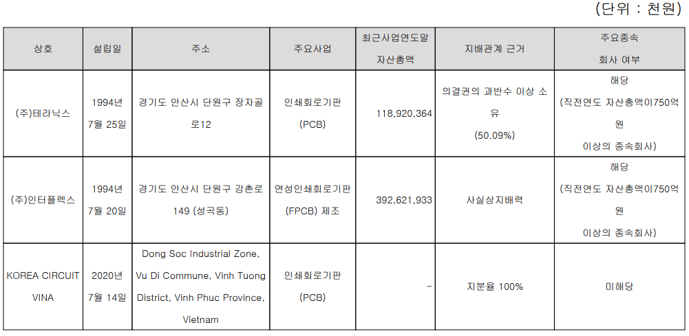 당사는 3개의 종속회사를 보유하고 있으며, 연성회로기판을 제조하는 인터플렉스, 인쇄회로기판을 제조하는 테라닉스 및 베트남 현지 법인이 있습니다. 최대주주는 (주)영풍으로 당사 지분율 37.16%를 보유하고 있습니다.