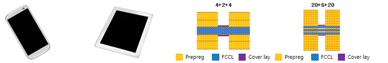 Rigid-flexible PCB 제품의 경우 Bending(휘어짐)이 가능한 구조로 3차원적 설계가 가능하여 제품의 소형화에 유리합니다. 당사는 Smart Phone, 스마트워치 같은 Wearable Device, Tablet PC 등에 적용할 수 있는 Rigid-flex를 공급하고 있습니다.
