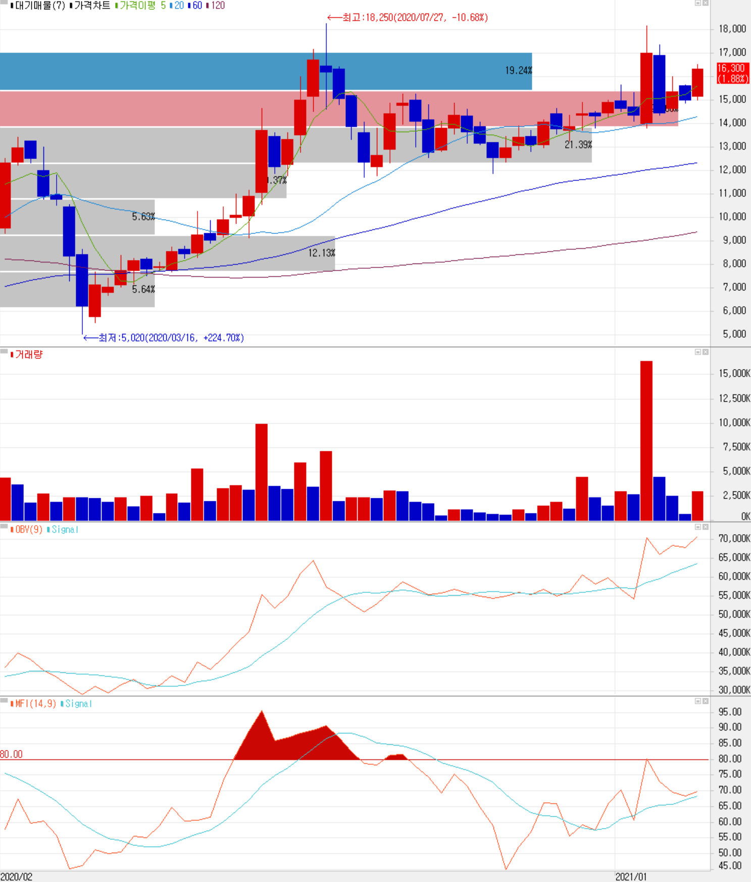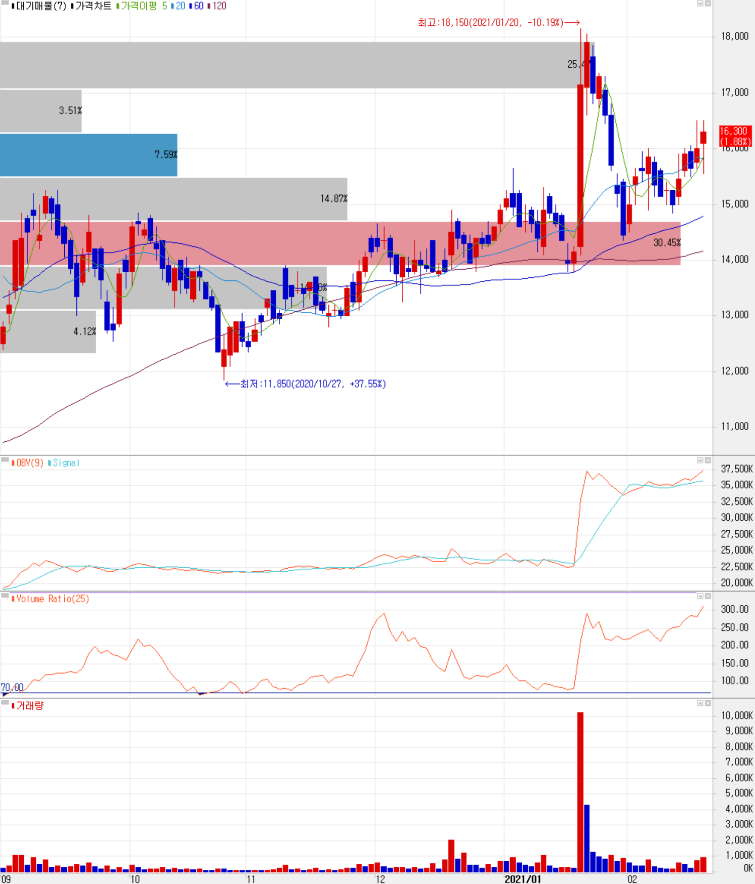 현재 기술적으로는 17,500원 근처를 1차 저항선으로 보고 개인적인 중장기 목표가는 21,000을 설정했고, 하락 시 14,500원을 손절라인으로 보고 있습니다. 현재 아래 주봉 차트를 보면 이평선의 배열 상태나 주봉의 추세가 완만하지만 꾸준히 저점을 높이고 있는 상황이고 큰 매물대를 돌파했기 때문에 하락보다는 상승에 무게를 두고 대응하겠습니다.