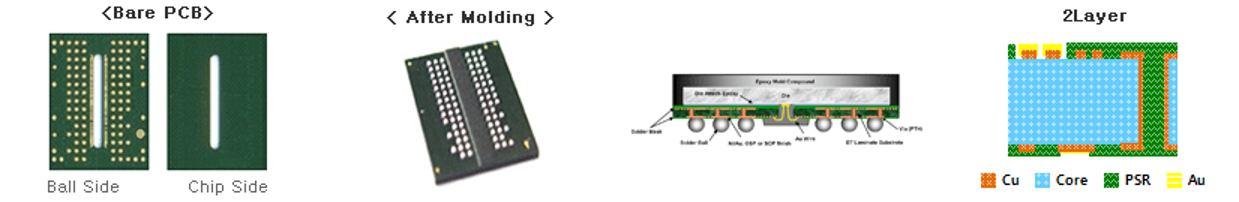 BGA(Ball Grid Array)는 칩이 보드 위에 실장되는 형태이며, BOC는 보드 하부에 칩이 실장 됩니다. DRAM과 보드 사이에 신호 손실을 최소화하기 위해 리드 타입 대신 BOC 방법을 사용합니다.