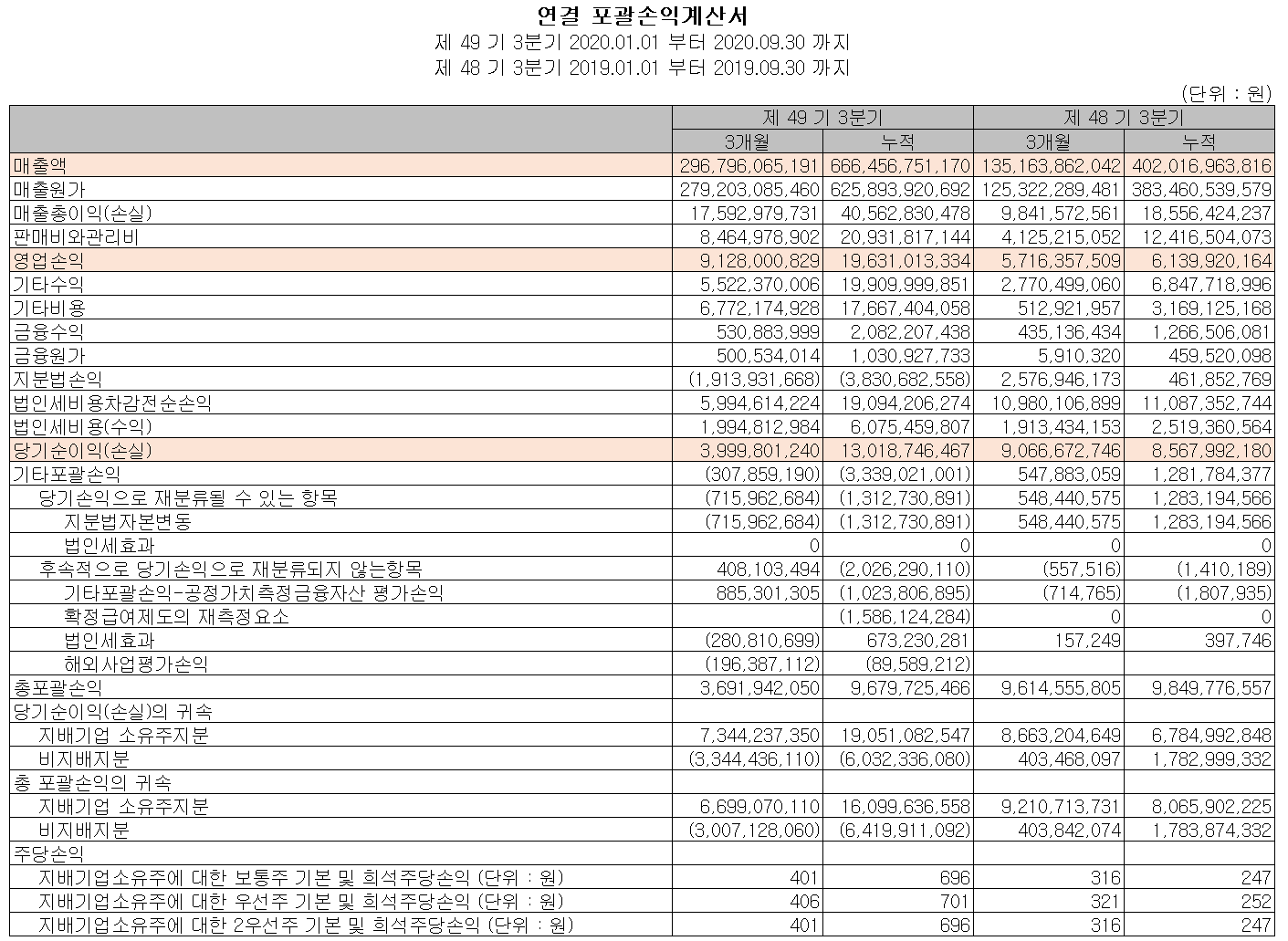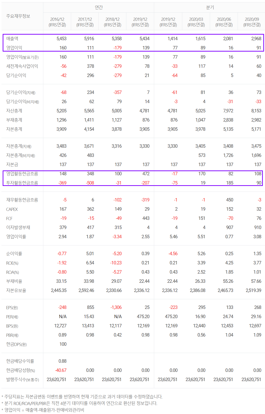 2020년 3분기 누적 기준 매출액은 6,665억 원으로 전년 동기 대비 65.8% 증가하면서 이미 2019년 연매출을 훨씬 웃돌면서 사상최고치를 기록할 예정입니다. 영업이익은 196억 원으로 219.7% 증가했고 당기순이익은 180.8% 증가했습니다.