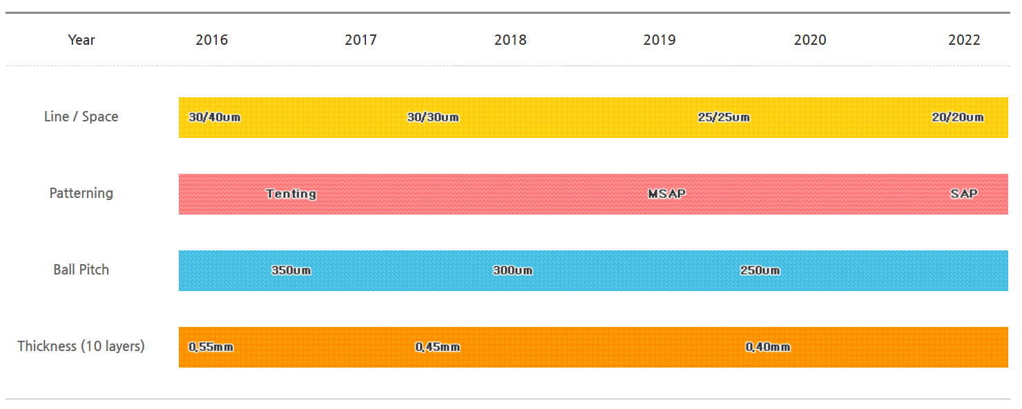 당사의 HDI 및 Package Substrate 관련 연구개발에 대한 로드맵입니다. 각 부문별 초박막, 초소형화 및 고성능화를 위한 로드맵을 바탕으로 연구개발을 하고 있습니다.