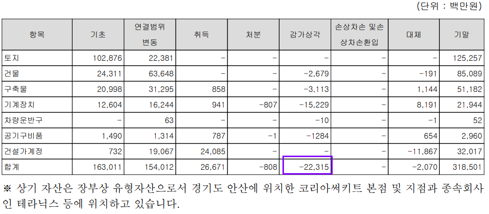 당사의 장부상 유형자산 내역에는 당사의 본점 생산 설비 및 테라닉스에 위치하고 있으며 3분기에 223억 원으 감가상각이 있었고 2020년 3분기 말 현재 총 유형자산은 3,185억 원입니다.