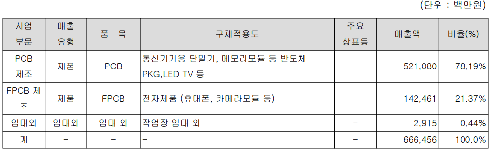 당사의 매출 구조는 크게 반도체 패키지용 PCB와 휴대폰 및 카메라 모듈에 적용되는 연성회로기판(FPCB) 제조 부문으로 구분됩니다. 반도체 패키지및 LED TV 용 PCB 제조 부문이 회사 전체 매출의 78.19%이며, FPCB 제조 부문이 21.37%의 비중을 보이고 있습니다.