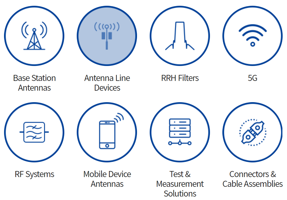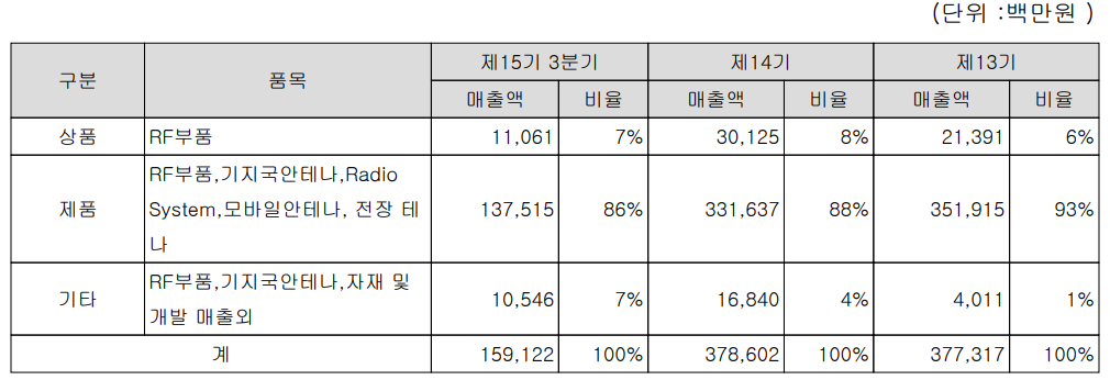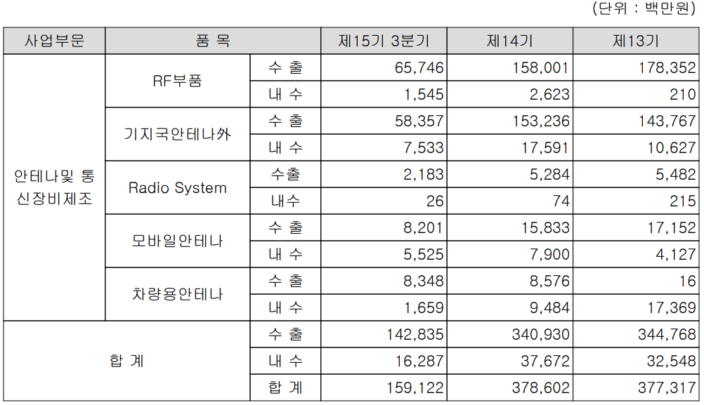 당사의 사업부문은 RF 부품, Radio System, 기지국 안테나, 모바일 안테나 등의 무선 통신 제품을 기반으로 한 모바일 네트워크, 자동차 전장 및 방위 산업 관련 사업 등으로 구분됩니다.