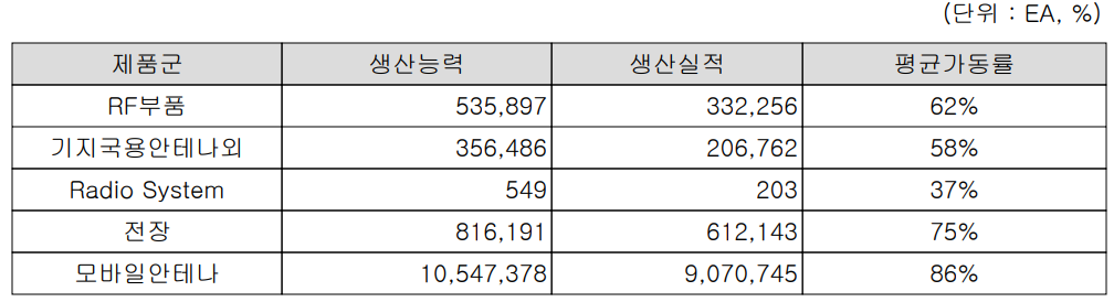 2020년 3분기 말 현재 생산 실적과 가동률은 전반적으로 코로나19의 영향으로 저조한 펴이지만, 자동차 전장 부문과 모바일 안테나의 가동률은 양호한 편입니다.