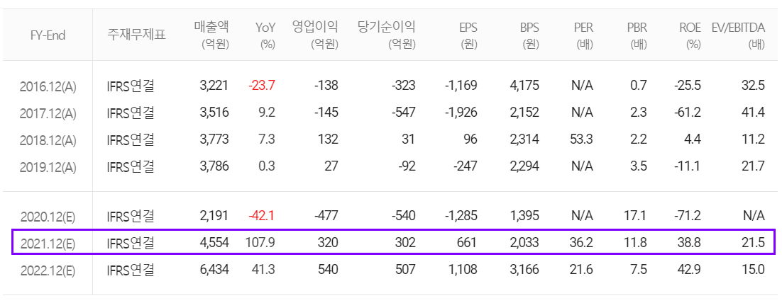 컨센서스 기준 2020년 연매출은 2,191억 원으로 전년 동기 대비 42.1% 감소하고, 477억 원의 영업적자를 추정했습니다. 2021년에는 4,554억 원의 매출로 2020년 대비 107.9% 증가하고, 영업이익은 320억 원을 추정했습니다.