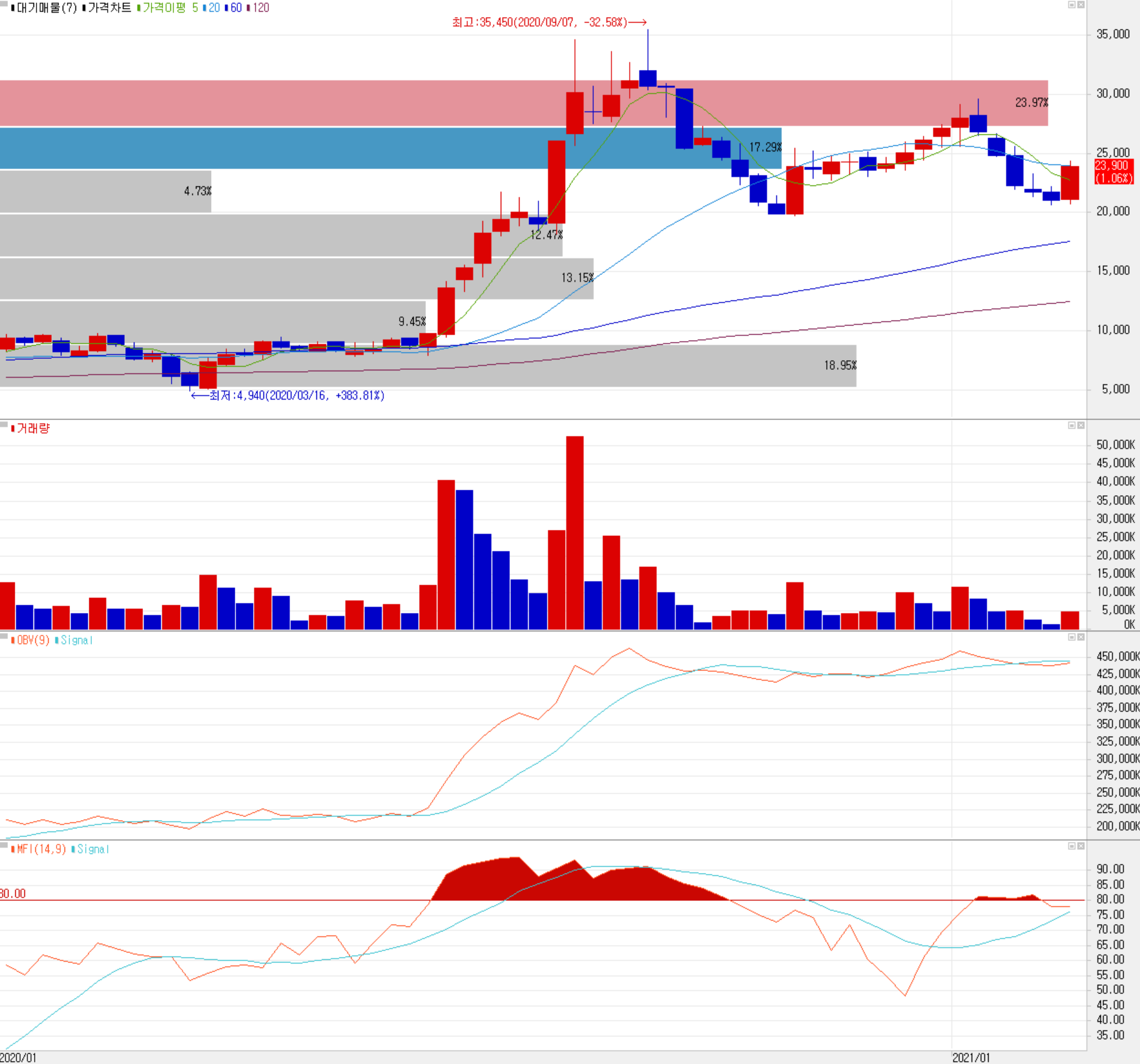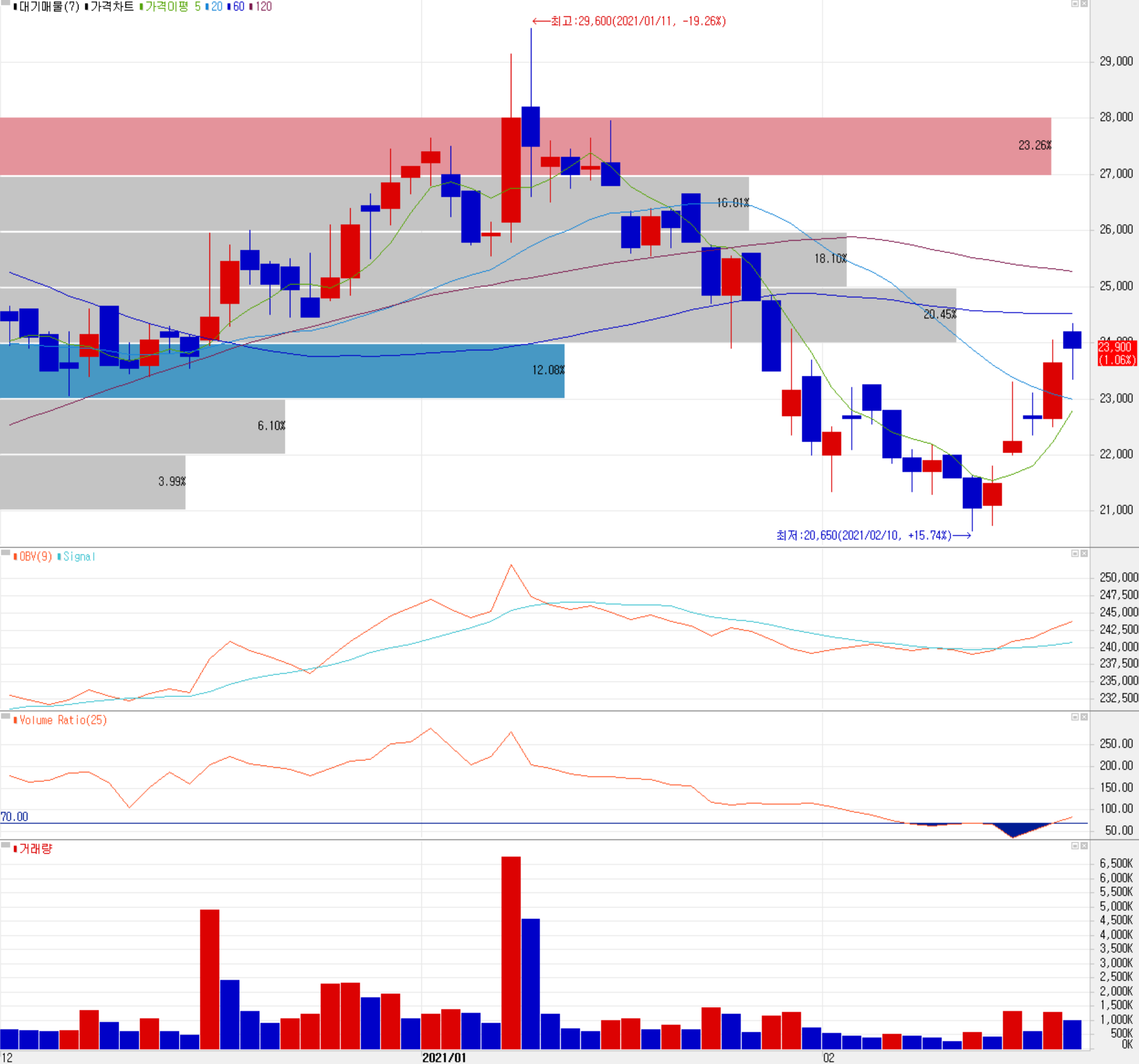 최근 주가는 전저점인 20,000원 선을 잘 지지하고 반등하는 모습이며, 수급에서는 개인 투자자의 매수 유입이 강한 추세입니다. 단기적으로 5일선을 잘 타고 가는 모습이지만 기관의 거래량이 점차 축소되는 형국이라 아쉽습니다. 60일 매물대에 대한 단기적 저항이 예상되어 상승 시 25,000원을 돌파할지 보고, 하락 시 22,000원을 1차 지지로 설정한 후 접근할 예정입니다. 주봉상 중장기적으로는 지난 6월 코로나 팬데믹에서 회복된 후 가파르게 상승하면서 대기 매물에 대한 부담이 조금 남아 있는 것으로 판단됩니다만 추세전환의 시기가 올 것 같습니다.
