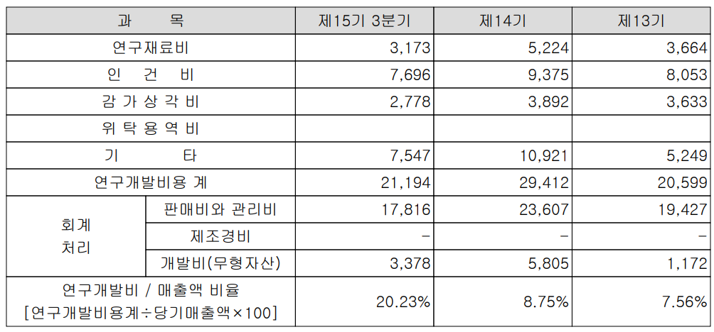 최근 3년간 연구개발비를 보면 2020년 들어 매출액 대비 비율은 크게 증가했으나 2019년 대비 투자 금액은 감소할 것으로 보입니다.