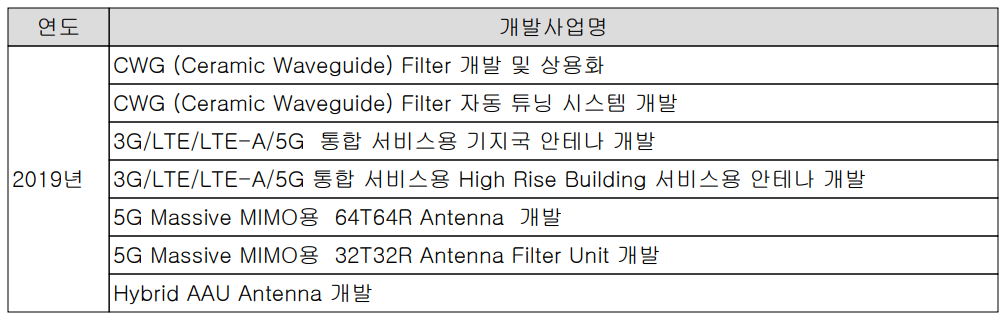 주로 5G 관련 무선 통신 장비 및 안테나의 개발과 필터류의 개발 실적이 있습니다. 위에 소개한 세라믹 필터와 5G mMIMO에 대한 개발 실적이 주를 이루고 있습니다. 5G는 2019년 4월 한국인 세계 최초로 상용화 서비스를 시작했고, 지난 1월 세계에서 가장 큰 이동통신 시장인 미국이 최근 5G 주파수 경매를 마무리하면서 본격적인 인프라 투자가 예상되고 있습니다.