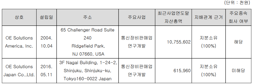 당사는 현재 미국과 일본에 통신 장비의 판매 및 연구개발 목적으로 설립된 현지 법인이 있습니다.