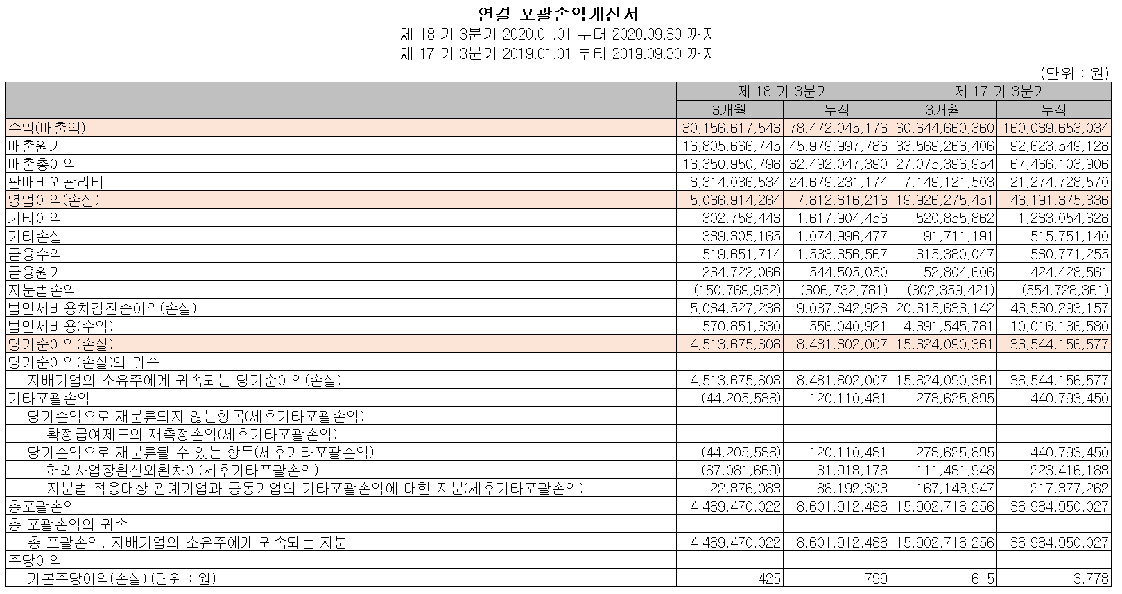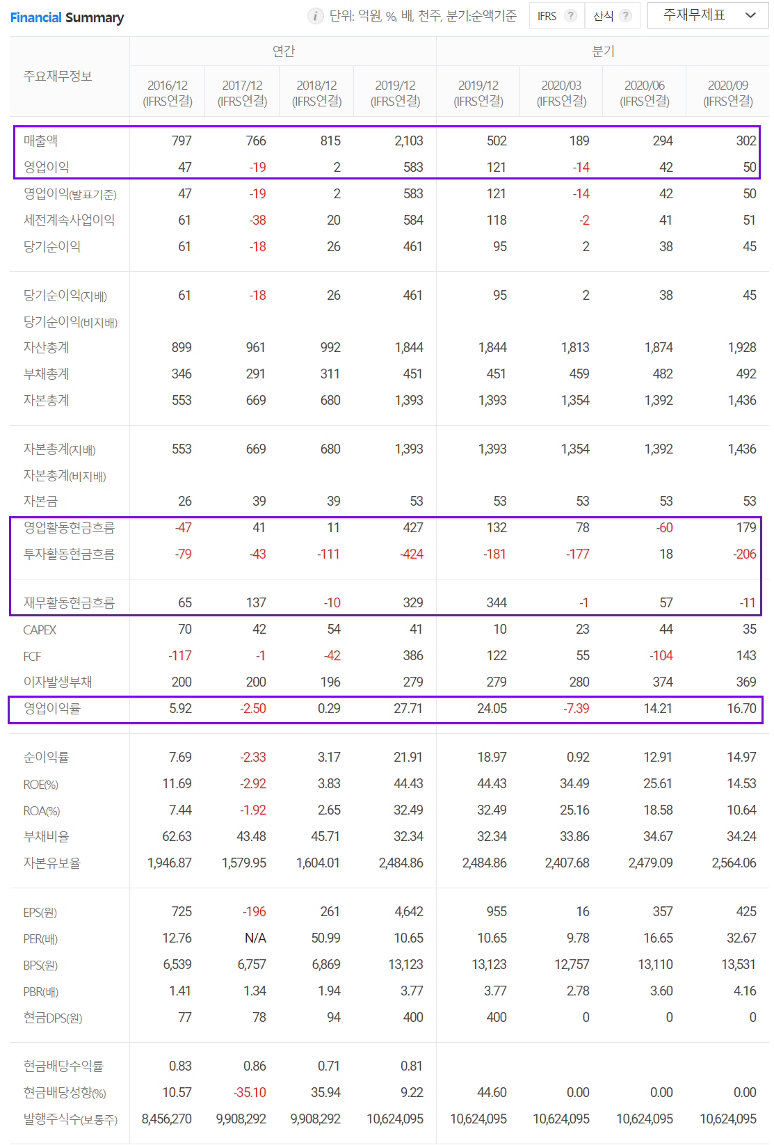 코로나19 영향으로 1분기에는 영업손실을 기록했으나 2분기부터 흑자 전환하면서 회복세를 보이고 있습니다. 3분기 말 기준 당사는 유상증자를 통하여 신규 사업인 광소자의 생산 설비를 확대하였고, 영업 이익률의 개선도 주목됩니다.