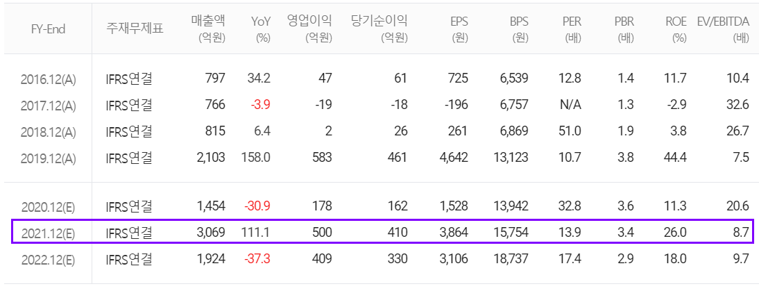 지난 2월 5일 당사의 잠정 실적은 연간 매출액 1,032억 원, 영업이익 73.5억 원을 기록할 것으로 공시했습니다. 전년 동기 대비 매출액은 51% 감소, 영업이익은 87.4% 감소했습니다. 2020년 컨센서스가 잠정실적과 큰 차이를 보이니 2021년이 어떨지 모르겠습니다. 컨센서스는 2021년 매출액 3,069억 원으로 사상 최고 매출을 기록하고, 영업이익도 500억 원에 이를 것으로 추정했습니다. 추정치는 모르겠으나 5G 투자 재개 및 신규 사업인 광통신용 소자에 대한 기대만으로도 충분히 2019년 실적을 넘어서지 않을까 예상합니다.