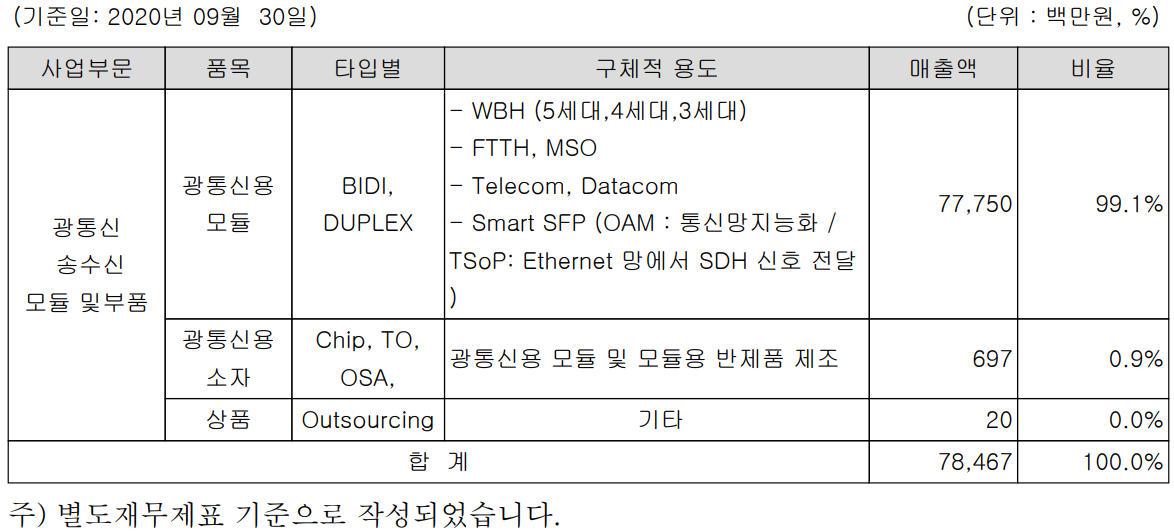 2020년 3분기 말 기준 광통신용 모듈의 매출은 778억 원으로 전체 매출의 99.1%의 비중을 보이고 있습니다.
