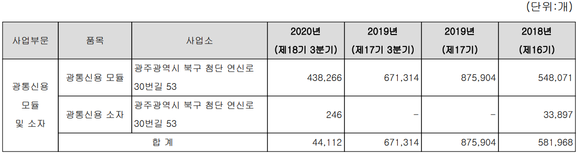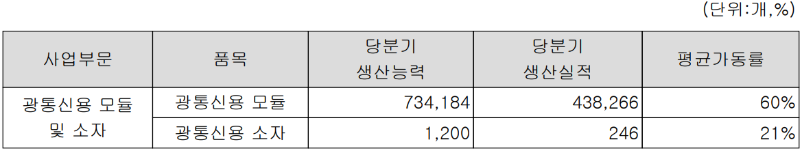 당사는 2020년 광통신용 소자를 국산화하여 양산을 시작했습니다. 이에 따라 10G/25G/100G 등 당사의 트랜시버 제품을 내재화할 수 있게 되어 향후 광소자의 매출은 물론 트랜시버의 수익성도 크게 개선될 것으로 기대가 됩니다.