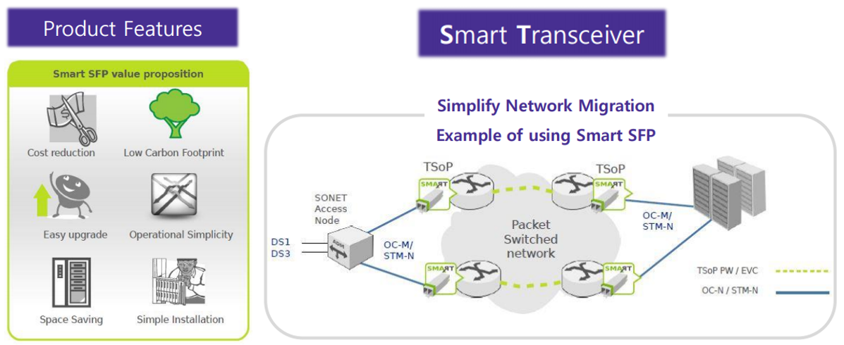 프로토콜 변환, 통신망 지능화 등 통신시스템을 통해 구현되는 기능을 트랜시버에 탑재하여 저비용, 고효율로 네트워크 구축이 가능하게 하는 제품으로서, 오이솔루션의 하드웨어 기술과 AIM Valley의 소프트웨어 기술이 합쳐 공동 개발한 세계 최초의 독자 기술입니다.