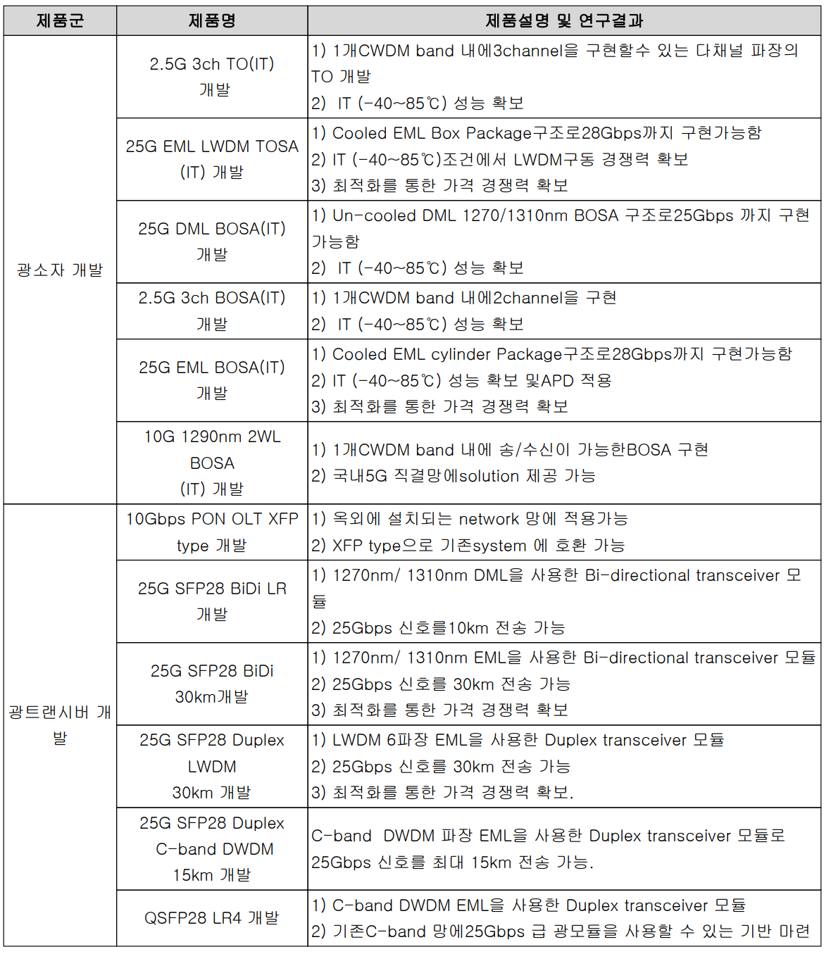 당사는 칩 개발팀, 제품 개발 팀 및 선행 기술 개발 팀 등으로 구성된 연구소 조직을 통하여 다양한 광통신 관련 소자와 트랜시버를 연구, 개발하고 있습니다. 광트랜시버는 고객사로부터 수주를 받기 위해서 제품 단품의 승인과 시스템에 장착 후 성능 시험 등을 장기간 검증해야 하기 때문에 당사의 선행 개발 및 차별화된 제품 확대가 매우 중요합니다.