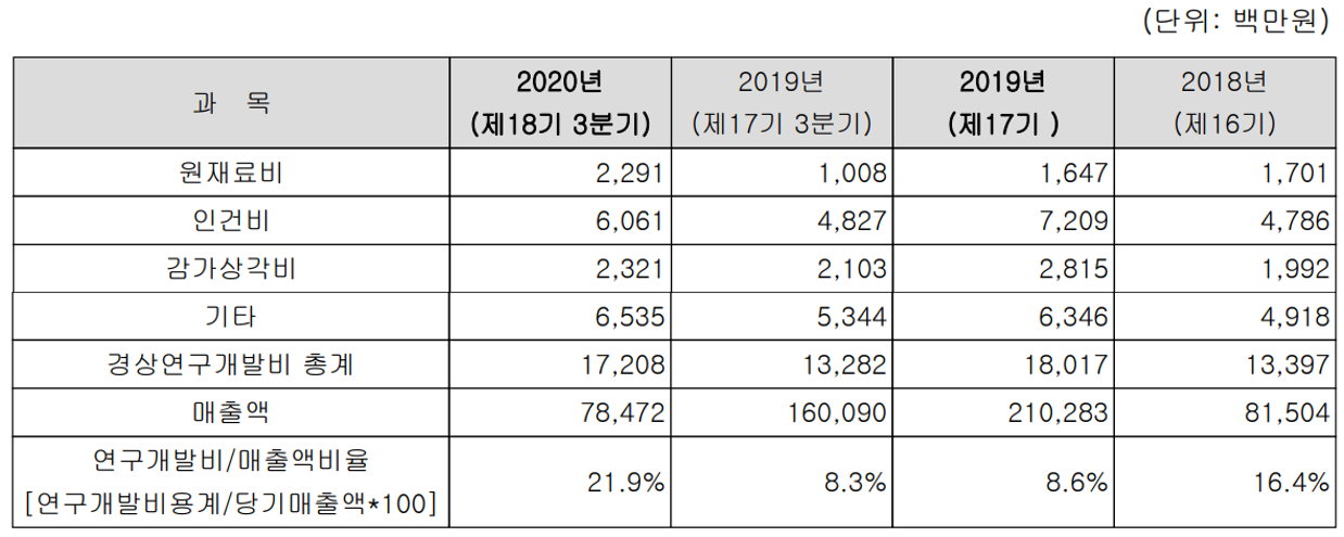 지난 2020년 3분기 말 기준 당사는 전체 매출의 21.9%인 172억 원의 연구개발비를 사용했습니다. 절대 비용으로 보면 매출이 50% 가까운 감소에도 연구 개발비는 30% 가까이 증가했습니다.