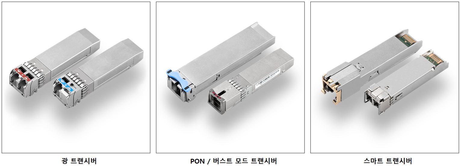 당사의 제품 군은 크게 광 트랜시버, PON/버스트 모드 트랜시버 및 스마트 트랜시버 등으로 구분됩니다.
