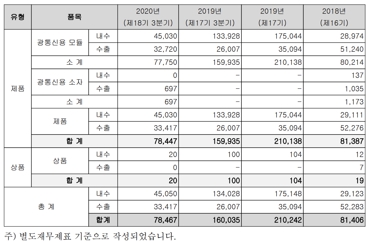 당사의 주요 제품에 대한 매출에는 광통신용 모듈과 광통신용으로 사용되는 소자 등으로 구분됩니다.