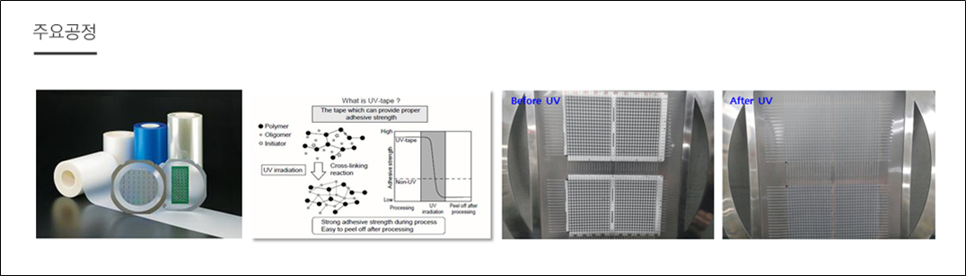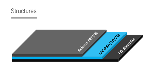 디스플레이 제조 공정 중 Sawing 공정 시 UV 조사 전 고점착, UV 조사 후 저점착 특성을 지닌 기능성 테이프입니다.
