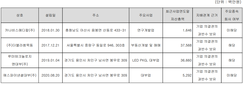 당사는 2020년 9월 현재 4개의 종속회사가 있으며, 사업다각화의 일환으로 '역세권 2030 청년주택 사업'의 사업시행자인 (주)더블라썸묵동을 인수하였고, 이듬해인 2018년에는 카이스트와 협력을 통해 의료용 마리화나를 연구하는 목적으로 카나비스메디칼(주)를 설립하였습니다. 루미테크놀로지앤대부(주)는 지난해 관계사였던 루미마이크로가 지분을 당사에 매각하면서 지분율 55% 보유하게 되었습니다.